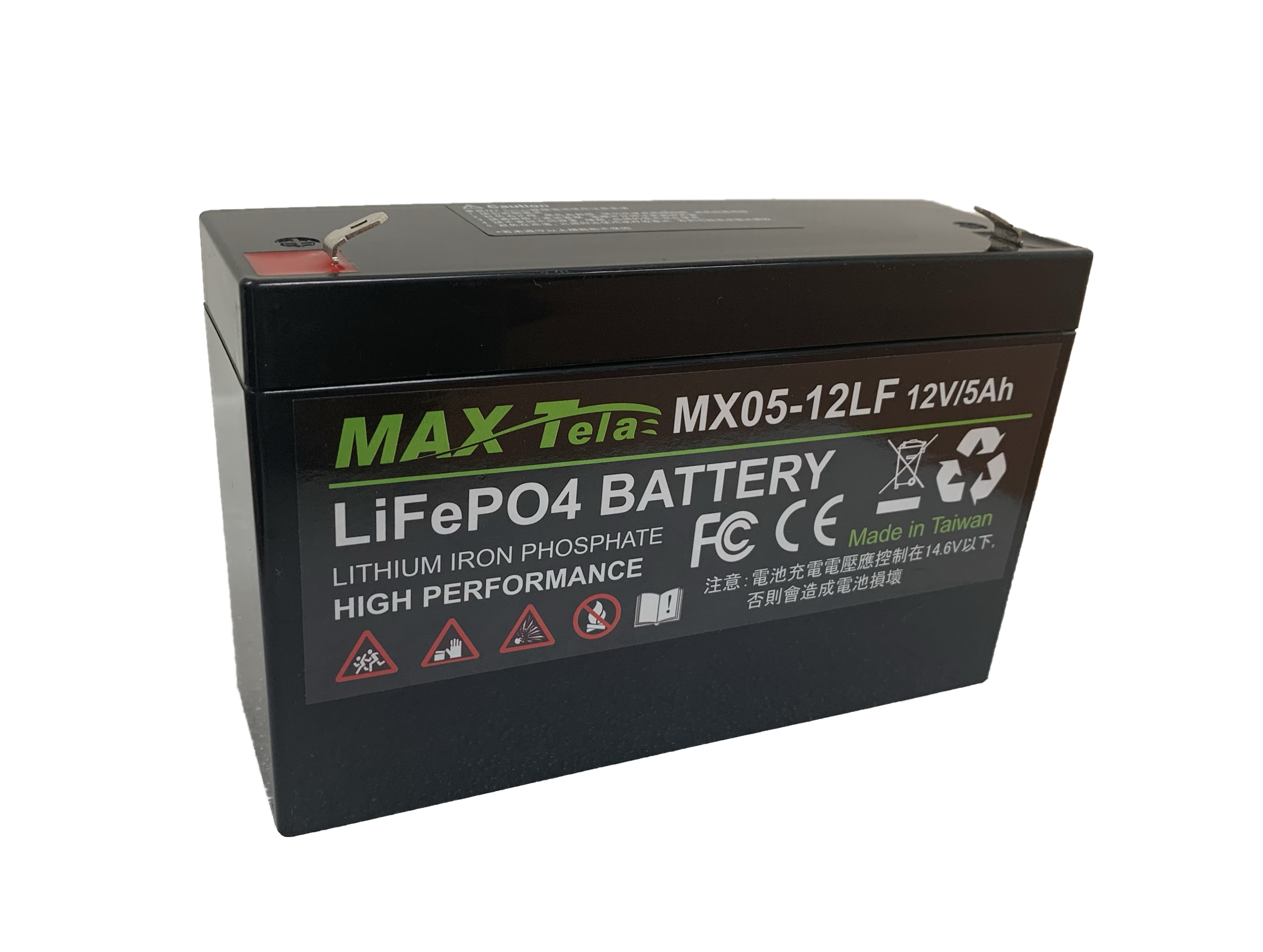 Maxtela ELB LiFePO4 battery series is designed to be powerful to suit various smaller deep cycle applications, such as electric wheelchairs and electric bikes. The MX05-12LFM is a lithium iron phosphate (LiFePO4) battery offering more power and less weight compared to the battery corresponding to lead-acid. LiFePO4 batteries also provide 10x longer life than lead-acid batteries, making such battery the best choice when draining the energy for the deep-cycle applications