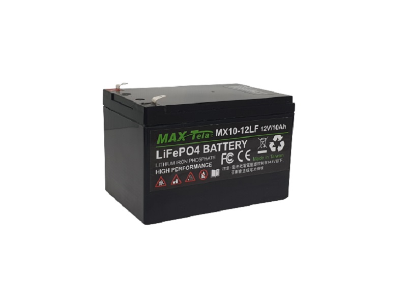 Maxtela ELB LiFePO4 battery series is designed to be powerful to suit various smaller deep cycle applications, such as electric wheelchairs and electric bikes. The MX10-12LF is a lithium iron phosphate (LiFePO4) battery offering more power and less weight compared to the battery corresponding to lead-acid. LiFePO4 batteries also provide 10x longer life than lead-acid batteries, making such battery the best choice when draining the energy for the deep-cycle applications