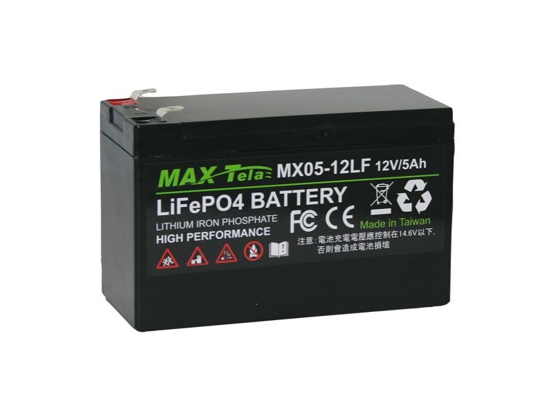 Maxtela ELB LiFePO4 battery series is designed to be powerful to suit various smaller deep cycle applications, such as electric wheelchairs and electric bikes. The MX05-12LF is a lithium iron phosphate (LiFePO4) battery offering more power and less weight compared to the battery corresponding to lead-acid. LiFePO4 batteries also provide 10x longer life than lead-acid batteries, making such battery the best choice when draining the energy for the deep-cycle applications